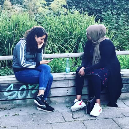 To unge kvinder, der sidder i et helle på Nørrebro og snakker sammen./2023